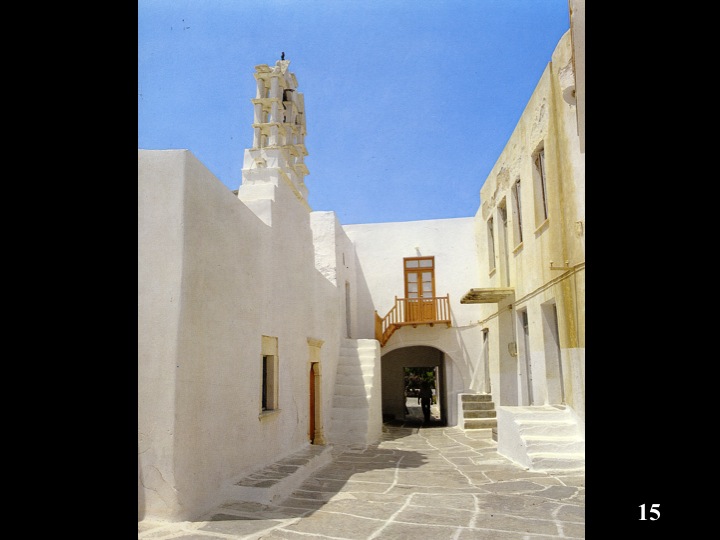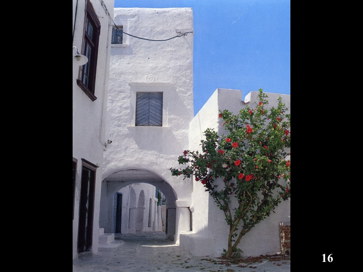 Now, we go to the island of Paros, in Greece (Image 15). Here, we find the concept of the fina—the one I told you about—that invisible area next to the property line. Remember, people build right next to the property line. No setbacks. But, they had the fina—which people could use. In this example from Paros, the minimum width of the street was maintained. But the use of the fina itself was up to the owners of whether to use it fully or not. The owner of the structure on the left has a bench here; there are stairs to the upper level; you can see the projection on the right is also within the fina. And then there is a sabat, the room bridging the street. In this case the sabat might belong to the owners of the structure on the left.