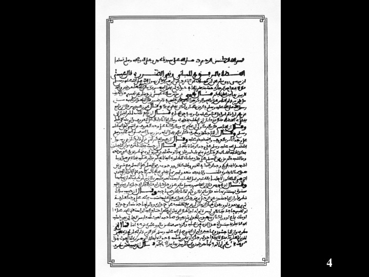 This is (Image 4) Ibn al-Imam’s manuscript from Tudela, in Spain. Four copies have survived. This is a sample page—page one—of one of the surviving copies. This text is readable, but the person who reads it has to be familiar with the script of the western Islamic world. This script is not used in the eastern Islamic world. It was also, of course, used in Spain prior to the 1500s. But the language is very clear.
