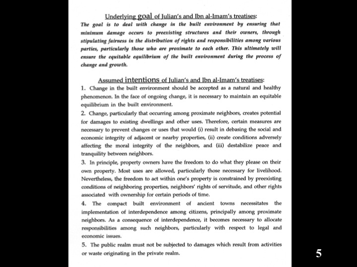 In comparing these two treatises—Julian’s and Ibn al-Imam’s—we talked about the similarities, but here we find some differences (Image 6). In the case of Ibn al-Imam’s treatise, the concept of the right to abut a neighboring existing structure is paramount. You have the right to abut an existing structure, which Julian does not go into. Also, the question of streets is very much addressed by Ibn al-Imam, but Julian does not talk about streets—unfortunately. His treatise is silent about that.